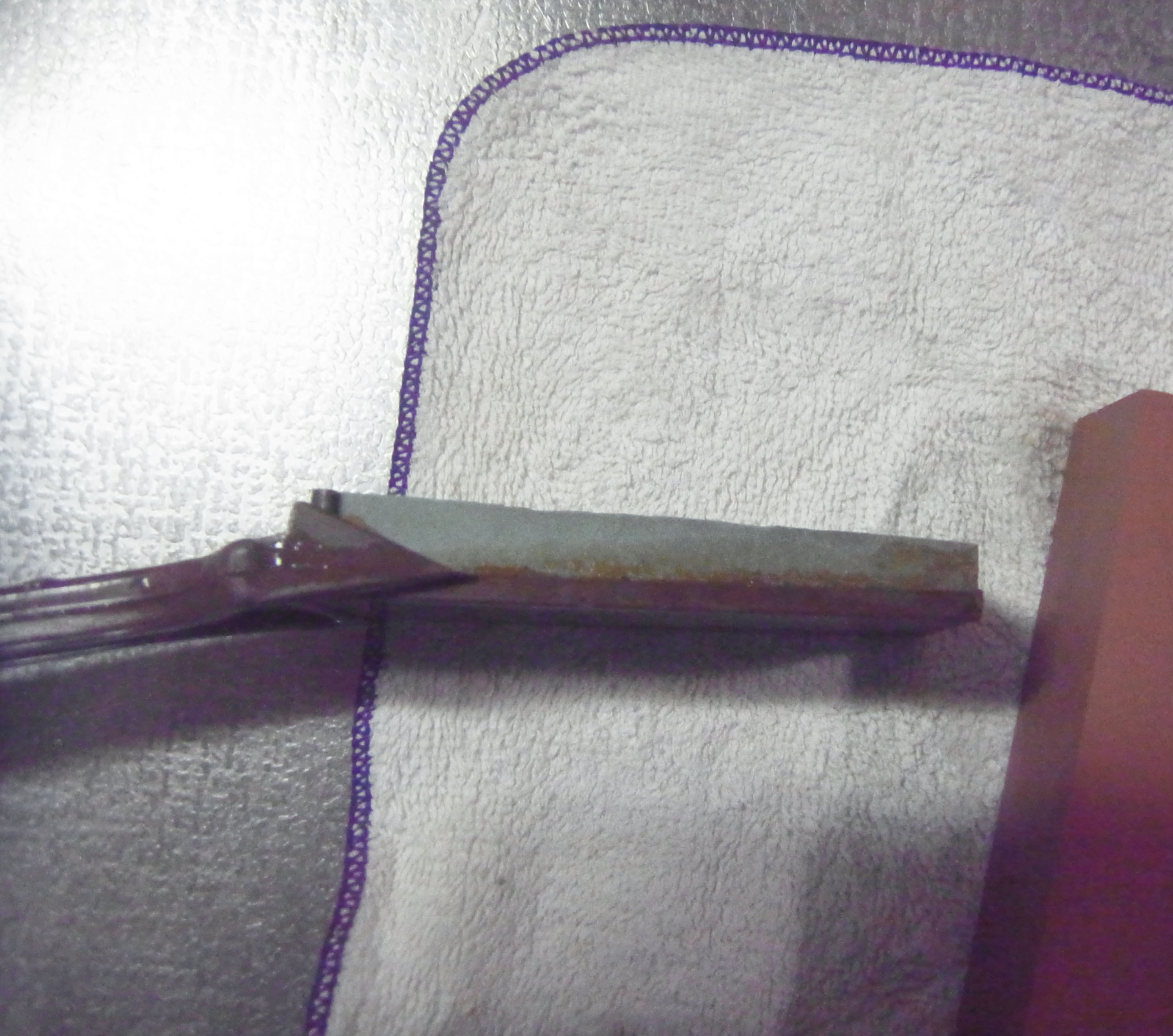 砥石に対して、縦に包丁を置いているため、中央部横がややへこんでいます。